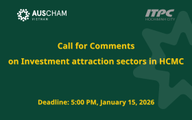 The Investment and Trade Promotion Centre of Ho Chi Minh City (ITPC) has invited AusCham Vietnam to provide consolidated feedback from its member enterprises on priority investment sectors in Ho Chi Minh City. Deadline is 15 January 2026.