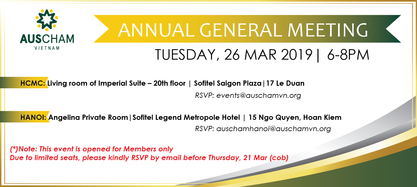 DOCUMENTSAGM AGENDA1. President’s Report regarding the activities of AusCham since the previous AGM. 2. President’s Report regarding proposed activities for the coming year. 3. Treasurer’s Report regarding the financial position for the year ended 31 December 2018 and proposed budget for year ended 31 December 2019. 4. To elect a National Board comprising four (4) representatives residing in Hanoi and eight (8) representatives residing in HCMC and that these Board Members will hold office from this date until the 2020 AGM. 5. To appoint an auditor. 6. To transact any other business properly brought forward at the AGM.NOTESAny member of AusCham who wishes to add an item to the agenda may do so by giving written notice to AusCham’s Office Manager, Lam Ngoc Phuong (email office@auschamvn.org ) no later than Friday, 15 March 2019.Registrations of Interest and EnquiriesTo register your interest in attending the AGM (members only) email:(*)Note: This event is opened for Members onlyDue to limited seats, please kindly RSVP by email before Thursday, 21 Mar (cob)**** The order of  2019 AusCham Board Candidates, which was drawed at AusCham Office ( 18 Mar 2019, 3.15pm) as below:Hanoi Candidates Order: