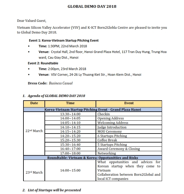Vietnam Silicon Valley Accelerator (VSV) and K-ICT Born2Globla Centre are pleased to invite you to Global Demo Day 2018.Event 1: Korea-Vietnam Startup Pitching Event- Time: 1:30PM, 22nd March 2018