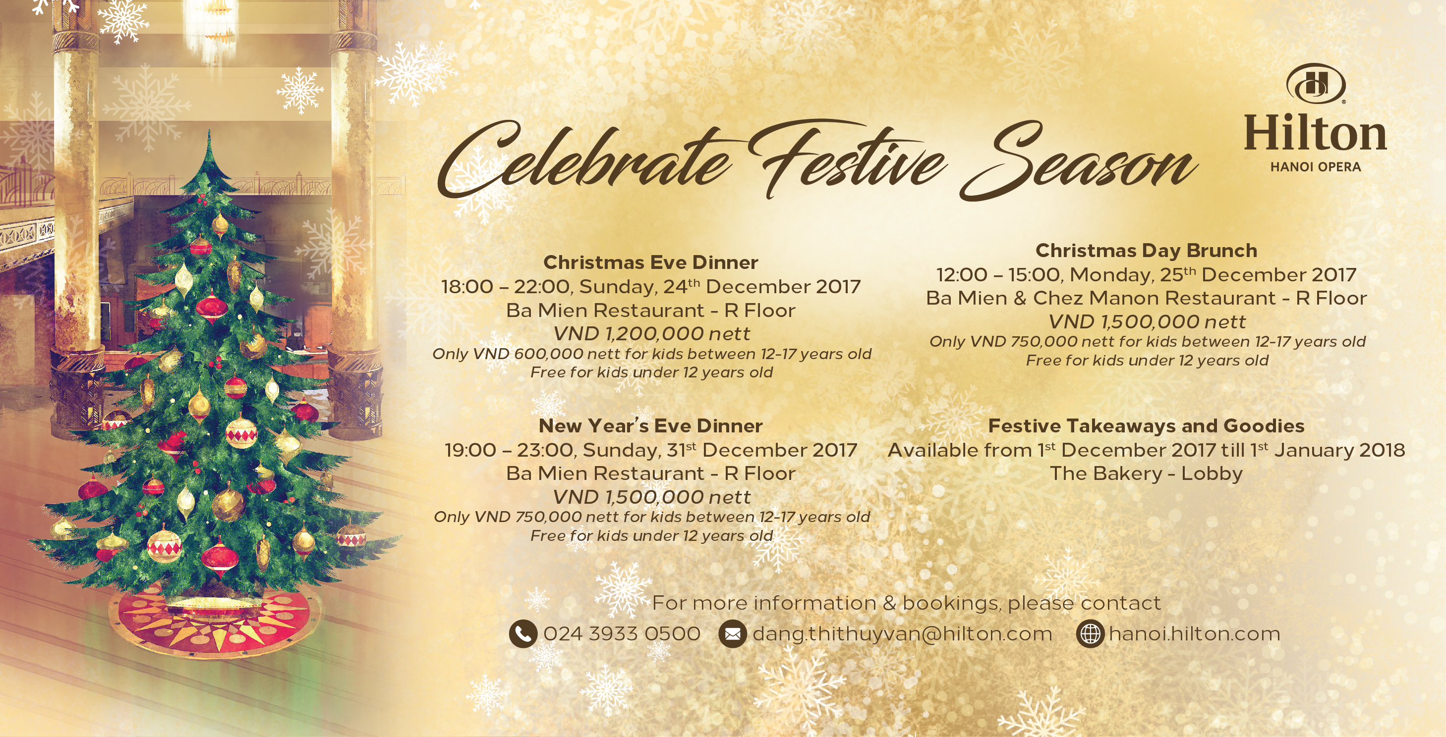 Time: 19:00 – 23:00, Sunday, 31st December 2017Place: Ba Mien Restaurant - R Floor, Hilton Hanoi Opera, 1 Le Thanh Tong Street, Hoan Kiem District, Hanoi Price: VND 1,500,000 nett Only VND 750,000 nett for kids between 12-17 years old Free for kids under 12 years old