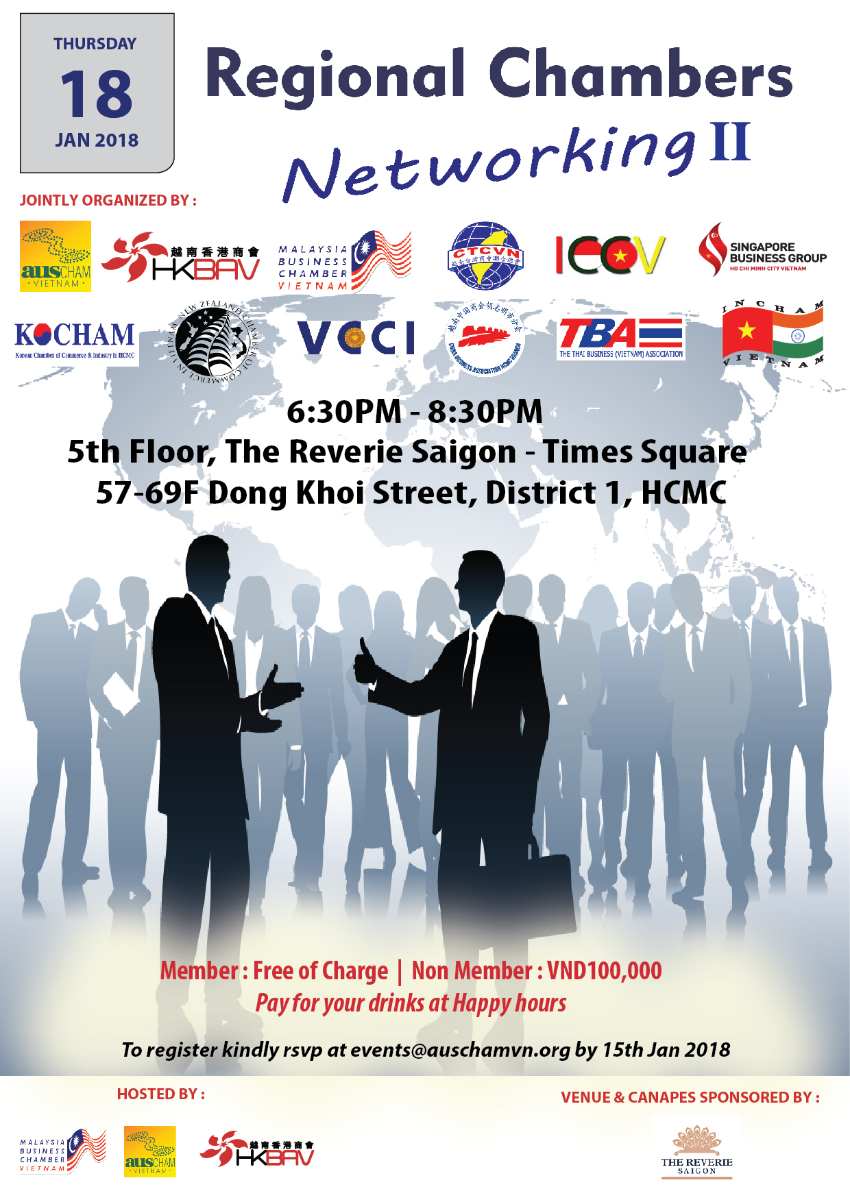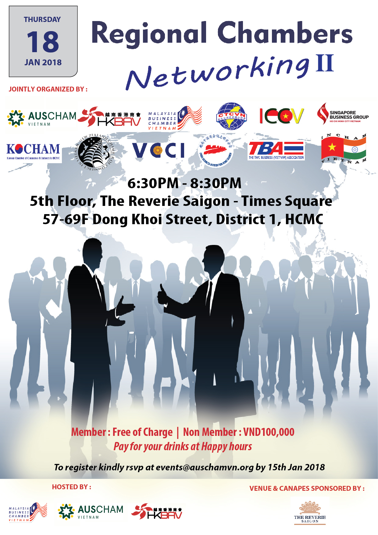 January 18, 2018Member : Free of Charge | Non Member : VND100,000 Pay for your drinks at Happy hours To register kindly rsvp at events@auschamvn.org by 15th Jan 2018