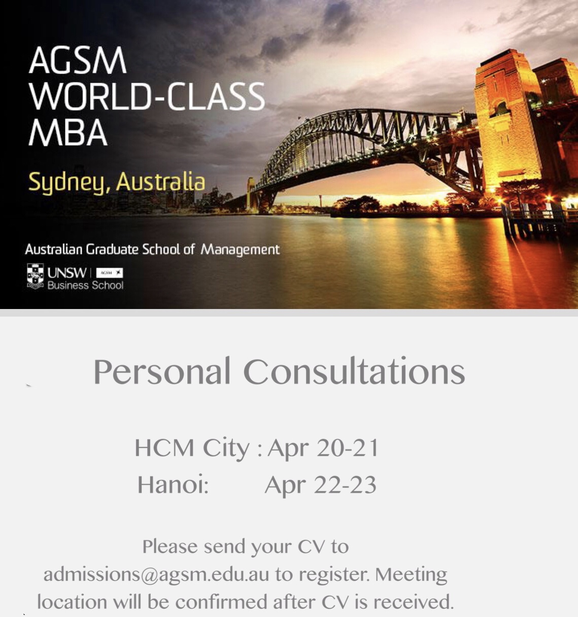 We invite you to attend a personal consultation with our AGSM recruitment representative who is travelling to Vietnam in April to meet with the best and brightest MBA candidates. Discuss your opportunity to study at our progressive, globally-ranked business school and to accelerate your career with AGSM MBA.