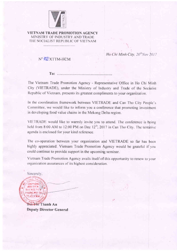 | 8:35 – 8:45am | Cơ hội phát triển thương mại và thu hút đầu tư ngành thực phẩm tại khu vực ĐBSCLOpportunity to develop businesse and attract investment to enhance the food value chain in the Mekong Delta | Lãnh đạo VCCI Cần ThơLeader of VCCI - Can Tho |