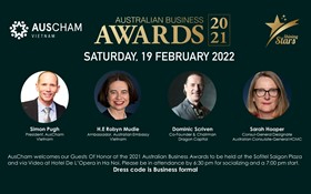 AusCham welcomes our Guests Of Honor at the 2021 Australian Business Awards to be held at the Sofitel Saigon Plaza and via Video at Hotel De L’Opera in Ha Noi. Please be in attendance by 6:30 pm for socializing and a 7:00 pm start.