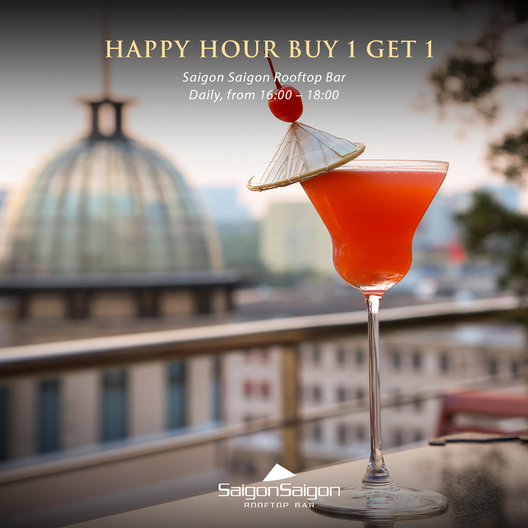 As the sun sets, enjoy Happy Hour from 16:00–18:00 with a BUY 1 GET 1 offer, then immerse yourself in vibrant rhythms throughout the evening at Saigon Saigon Rooftop Bar.